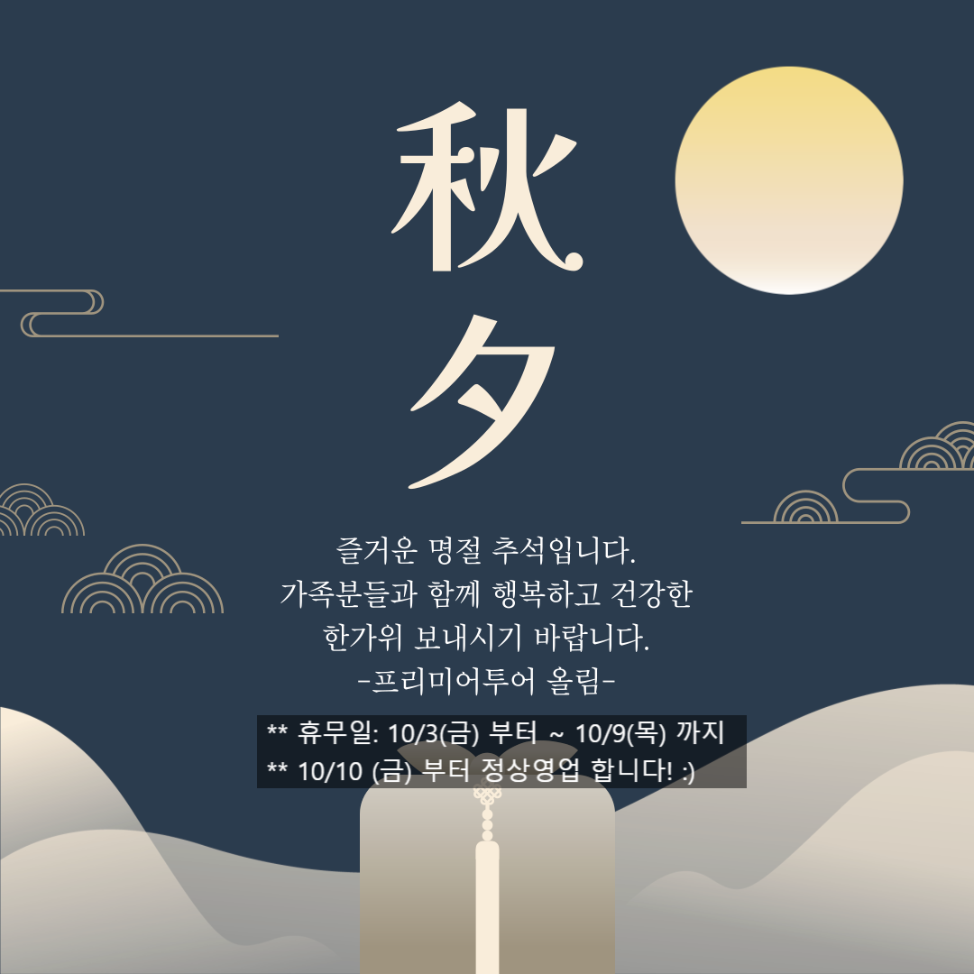 간단한 문의는 카카오 채널 "프리미어투어"로 문의주시면 응대해드리겠습니다-! 늘 건강하시고, 풍성한 한가위 되세요! 프리미어투어가 여러분과 함께하겠습니다